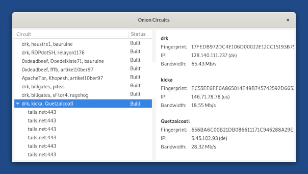 Cada circuit Tor està format per 3 repetidors de Tor. A l'exemple anterior, la connexió a tails.net passa pels 3 repetidors drk, kicka i Quetzalcoatl.